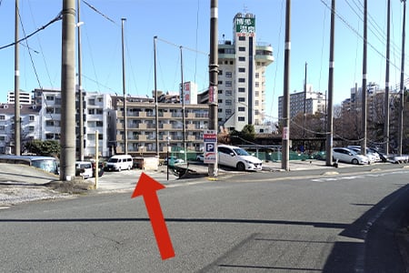 隣接する、ゴルフ練習場跡地へスロープをおりて名前のないところに駐車ください。